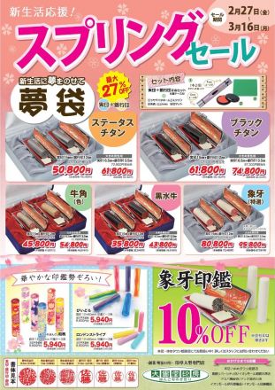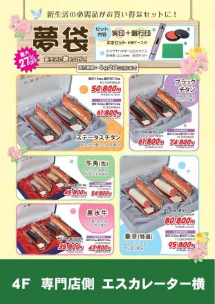 『スプリングセール開催中!』 新生活が始まる春に、 お得な2本セットはいかがでしょうか! 実印+銀行印の2本とネームエルツイン・朱肉・印マットがセットになった『夢袋』が好評受付中です 化粧ケースもついているので、 就職のお祝いにも喜ばれています。 象牙印鑑やチタン ・牛角(色) ・牛角(白)・黒水牛などの印鑑   もお買い得になっています。 セール期間:2月27日~3月16日まで 皆様のご来店をお待ちしております。