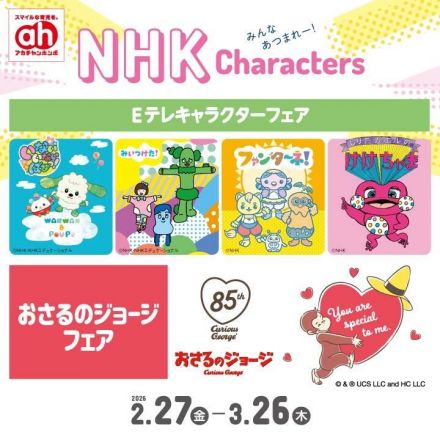 2/27(金)~3/26(木)の期間、NHKキャラクターフェア開催! 「いないいないばあっ!」「みいつけた!」「ファンターネ!」「しりたガエルのけけちゃま」「おさるのジョージ」など、NHKの人気キャラクターがアカチャンホンポに大集合♪ フェア期間中は、「おさるのジョージ」フェア掲載の商品を含む3,300円以上のお買い上げで「ちょこっとチャーム」をプレゼント!(全店計5,000点限定)