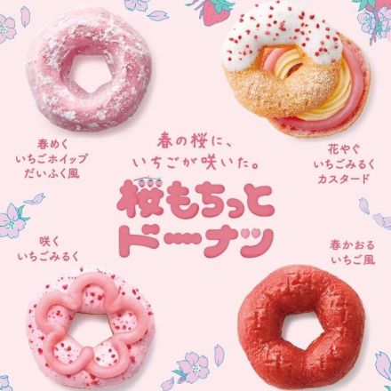 1階ミスタードーナツよりご案内申し上げます*.゚ 桜の季節がやってきました。 今年の桜もちっとドーナツは、 春らしさあふれるいちご味で登場しました^ ^ もちっとしたドーナツを頬張れば 口の中が春で満開に。 ふんわりもちっと生地に、 甘酸っぱいいちごホイップが入った「春めくいちごホイップだいふく風」、 さらに「花やぐいちごみるくカスタード」や「咲くいちごみるく」、「春かおるいちご風」の4種類がございます^ ^!! ご休憩やお持ち帰りにいかがでしょうか?? 是非この機会に1階ミスタードーナツにご来店くださいませ♪