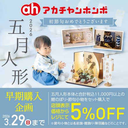 初節句おめでとうございます。 五月人形の早期購入企画を3月29日(日)まで実施しております。 五月人形本体と合計税込11,000円以上の節句小物をセット購入で店頭表示価格からレジにて5%OFFいたします。 また、国内送料当社負担でお届けします。 アカチャンホンポ会員様限定でひな人形プレミアム補償がついており、ご購入日から5年間ポイント補償がございます。 人気の兜収納飾りや兜ケース飾りのほか、鯉のぼり、名前旗や鯉飾りなどの小物も多数取り揃えております。 在庫には限りがございます。 人気商品につきましては早めのご購入をおすすめします。 ぜひ、ゆめタウン姫路3階アカチャンホンポまでお越しください★