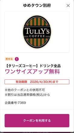 タリーズコーヒーよりお知らせ! 4月限定!タリーズ別府店限定! ゆめアプリク…