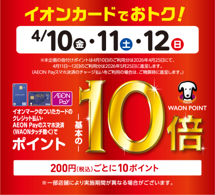 4/10(金)・11(土)・12(日)の3日間、 イオンマークのついたカードのクレジット払い もしくは AEON Payのスマホ決済(WAONタッチ除く) で WAON POINTが基本の10倍! ※「基本」とは、200円(税込)ごとに1WAON POINT進呈をさします。 イオンスタイル新金岡で おトクにお買物してくださいね! ご来店お待ちしております。
