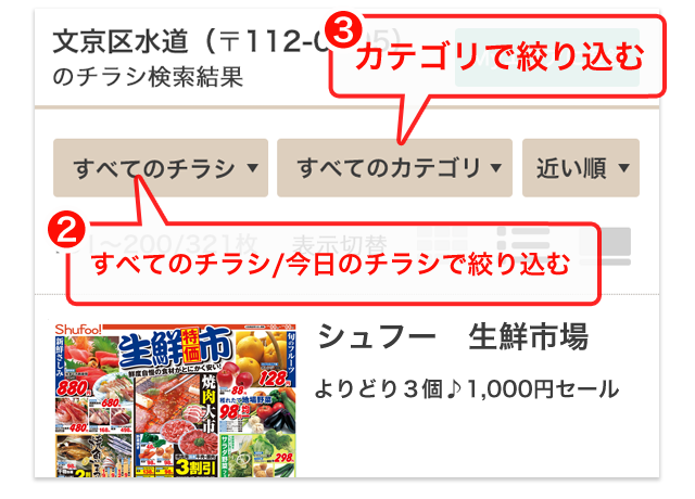「すべてのチラシ」「今日のチラシ」で絞り込む