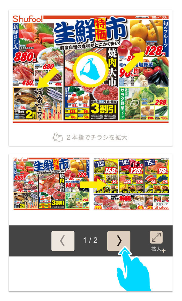 画面のダブルタップやピンチイン、ピンチアウトでチラシの拡大縮小も 自由自在。「次のページ」でチラシの裏側や次ページが見られます。