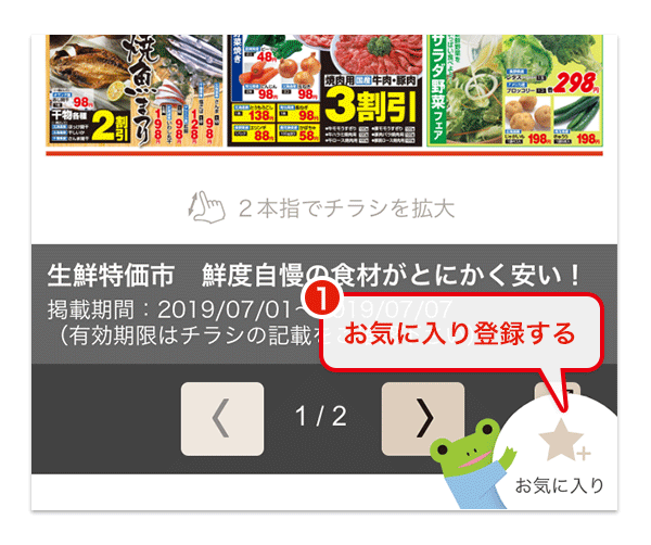 登録したい店舗のチラシページで、「画面右下に固定されているお気に入りボタンをタップしてください。